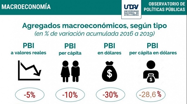 El Observatorio de Políticas Públicas de la Universidad Nacional de Avellaneda (UNDAV) reveló que el Producto Bruto Interno en dólares caerá un 28,6% en el período comprendido por estos últimos 3 años.