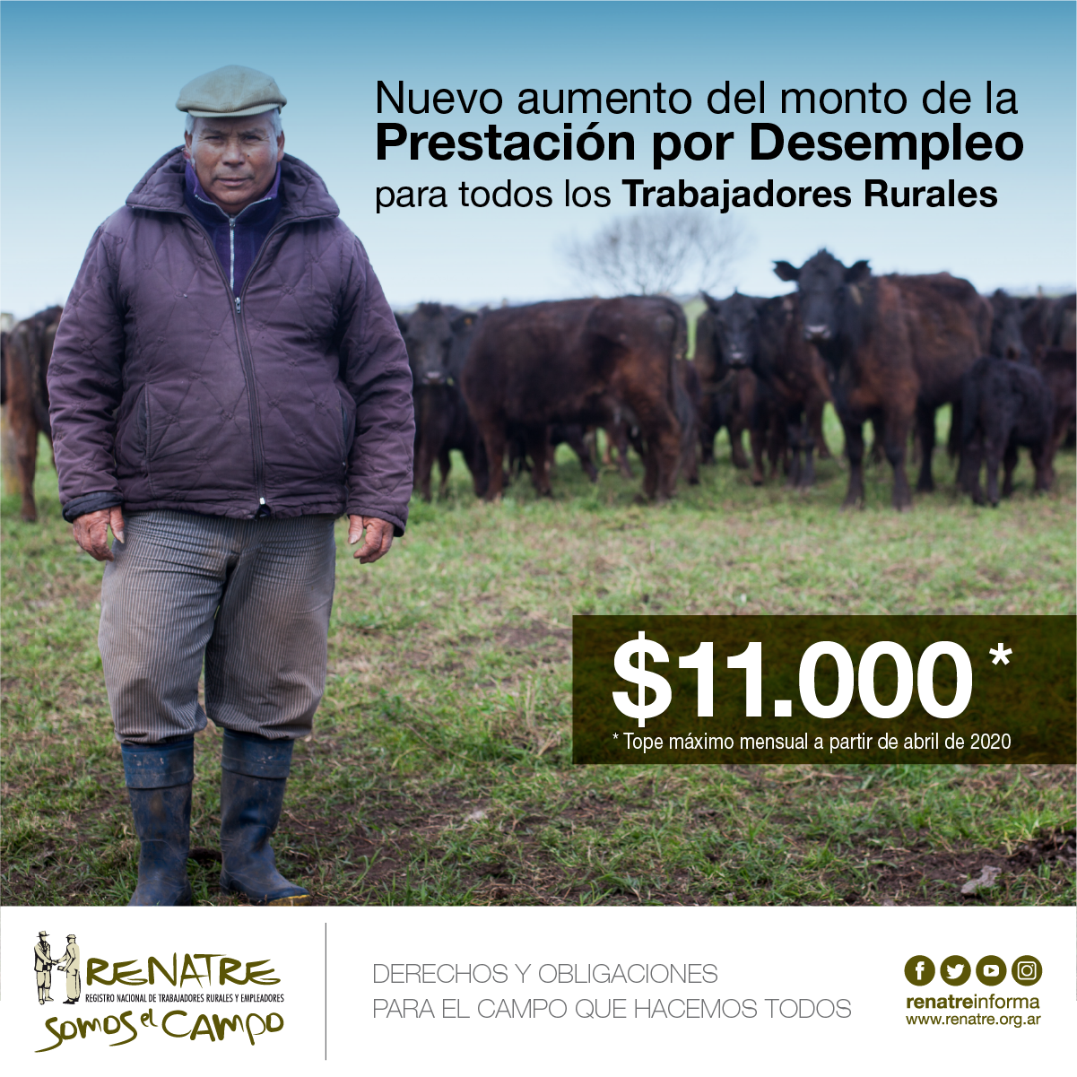 A partir del 1º de abril de 2019, el RENATRE (Registro Nacional de Trabajadores Rurales y Empleadores) aumentó el monto máximo de la prestación por desempleo a 11.000 pesos. De esta manera, según lo resolvió el Cuerpo Directivo del organismo, el incremento representó un 47,5% interanual, desde abril de 2019 hasta abril 2020.