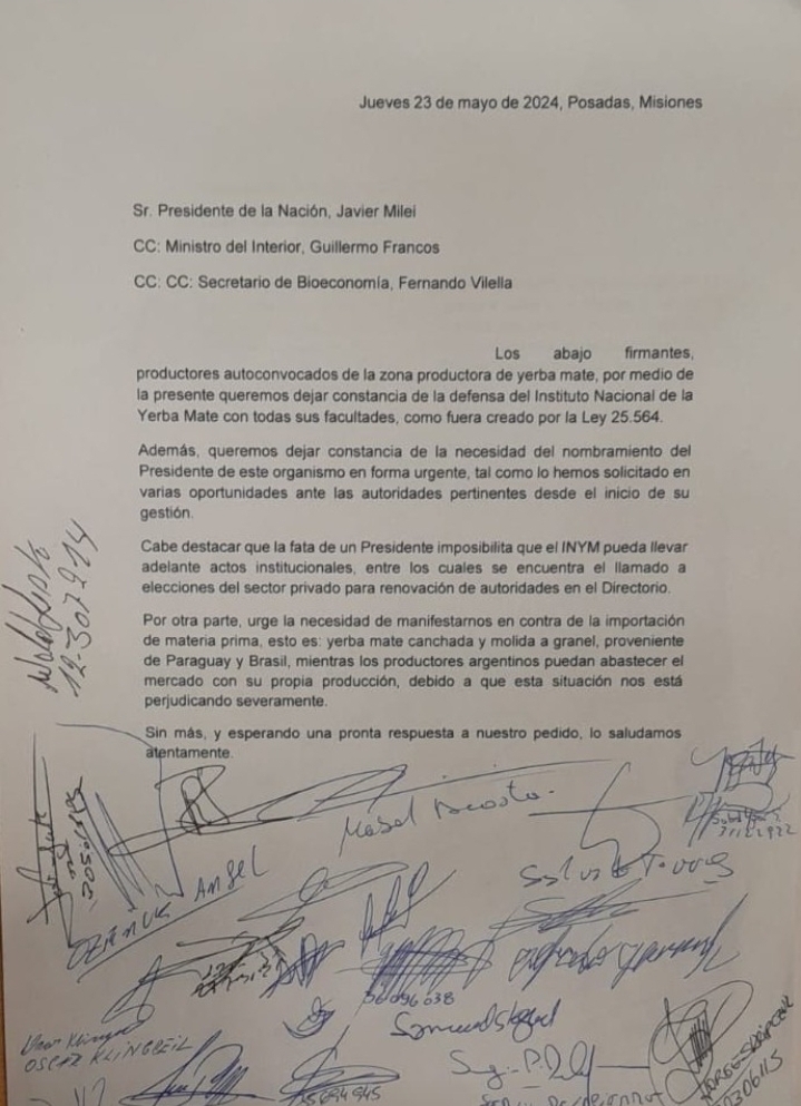 El primer escrito fue dirigido al Presidente de la Nación, Javier Milei, con copia el Ministro del interior Guillermo Francos y al Secretario de Bioeconomia, Fernando Villela. En él se detalla la “defensa del Instituto” por parte de los firmantes, “consta la necesidad del nombramiento del presidente de Organismo” y “la manifestación en contra de la importación de la materia prima”.