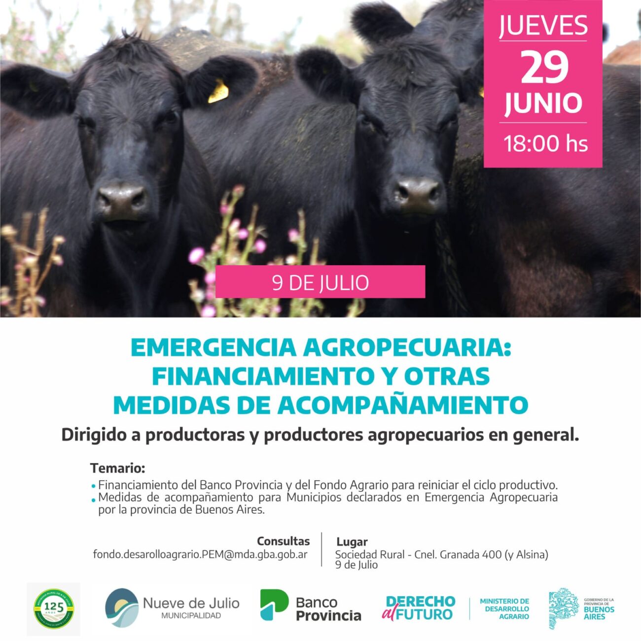 La Municipalidad de Nueve de Julio, a través de la Subsecretaria de Producción, y en forma conjunta con Ministerio de Desarrollo Agrario y la Sociedad Rural de 9 de Julio, desarrollarán este próximo jueves 29, a las 18 hs., en las instalaciones de la citada institución de calles Granada y Alsina, una interesante charla sobre el tema “Emergencia agropecuaria: financiamiento y otras medidas de acompañamiento”, dirigido a productores agropecuarios en general.