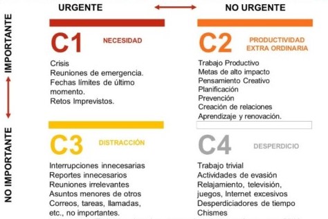 Stephen Covey propone un modelo de cuatro bloques, donde se ubican tus actividades en función de la urgencia y la importancia.