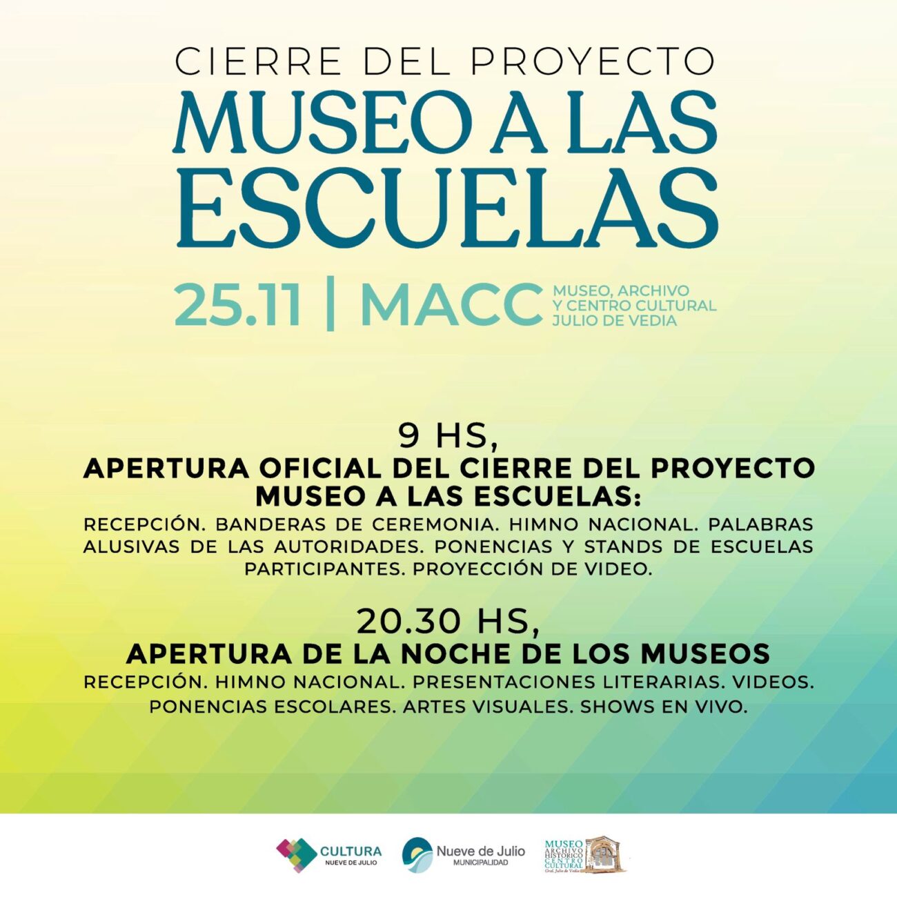 9 hs., Apertura oficial del cierre del proyecto Museo a las Escuelas: recepción, Banderas de Ceremonias. Himno Nacional. Palabras alusivas de las autoridades, ponencias y stands de escuelas participantes, con proyección de videos.