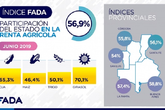 La cifra surge del denominado Índice FADA, elaborado por la Fundación Agropecuaria para el Desarrollo de Argentina, que cada tres meses publica un informe del «peso» del Estado sobre la renta agrícola. En esta ocasión, la entidad concluyó que de cada $ 100 ganados, los diferentes estamentos del Estado se quedan con $ 58,80. No obstante, en el primer trimestre del año, ese valor a los $ 63,2.