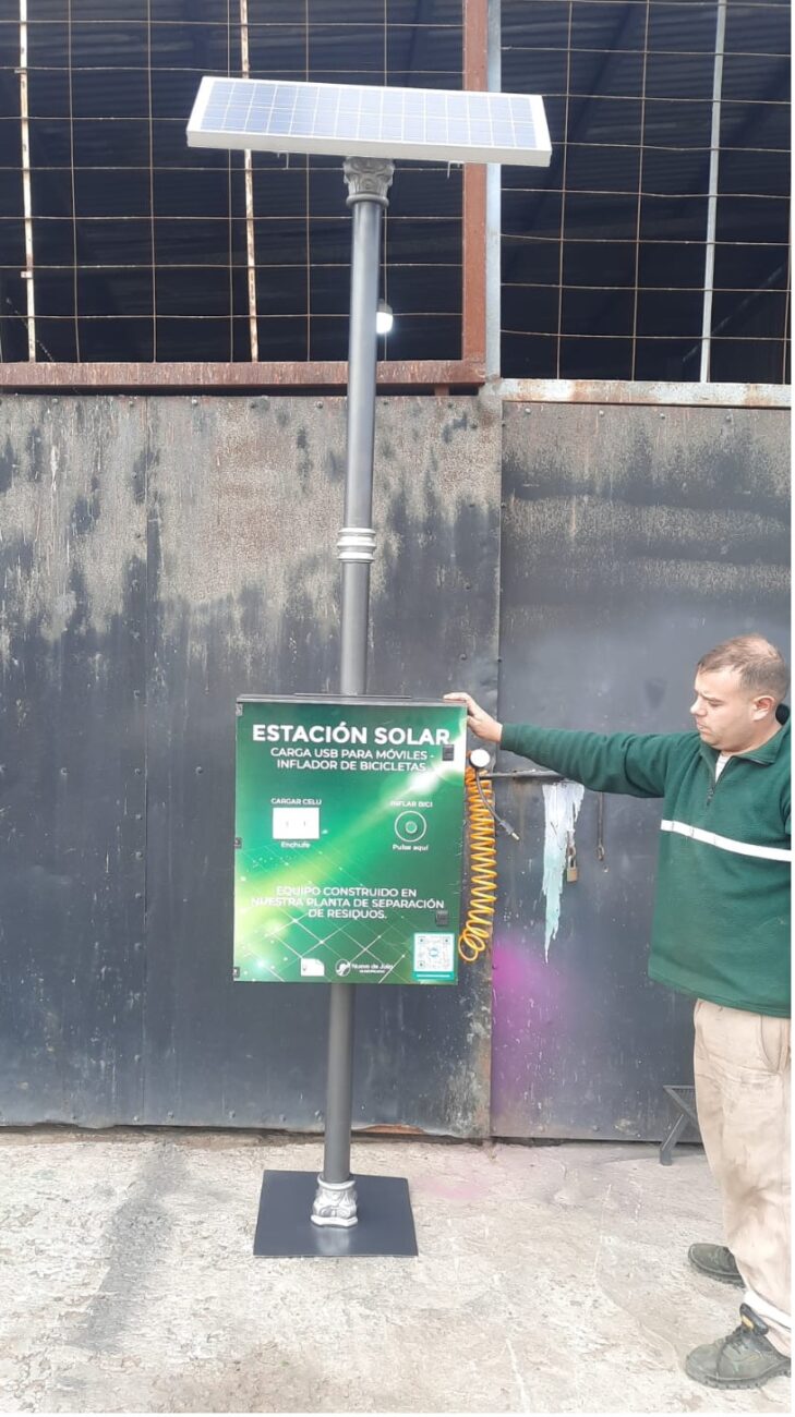 A partir de un panel solar se recibe la energía necesaria para ser acumulada en una batería, que permite utilizar esa energía para cargar celulares a través de fuente USB, e inflar bicicletas.