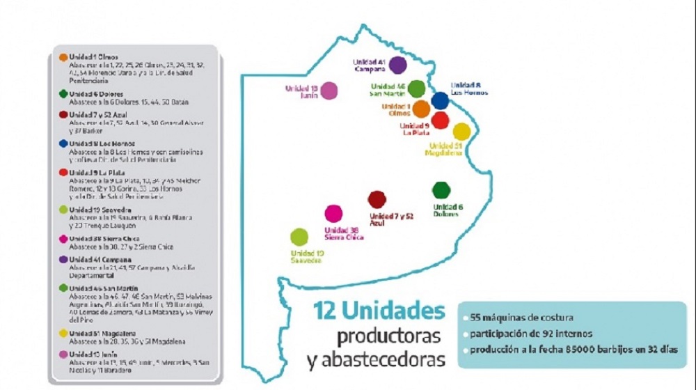 Desde la Unidad 6 Dolores se abastece a ese propio penal y los tres de Batán: 15, 44 y 50. Desde las Unidades 7 y 52 Azul se autoabastecen y distribuyen barbijos para los dos penales de General Alvear, las Unidades 14 y 30, y para la 37 Bárker.