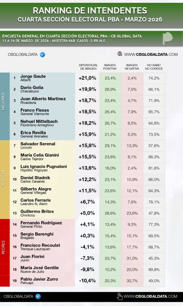 Se difundió el Ranking Seccional de Intendentes del Interior de la provincia de Buenos Aires y expusoo el complejo escenario político que enfrentan los jefes comunales de la Cuarta Sección Electoral de la provincia. El informe, correspondiente a marzo de 2026, elaborado por la consultora CB Global Data, revela contrastes significativos en la percepción ciudadana, donde la popularidad y el nivel de conocimiento parecen ser los principales obstáculos para algunos mandatarios locales.
