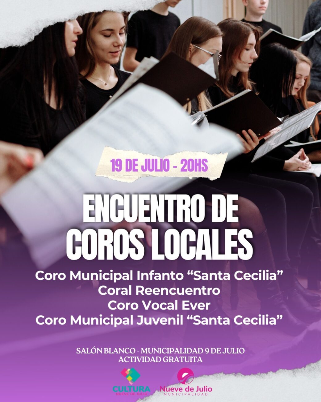Este sábado habrá un encuentro de coros locales en el Salón Blanco. Particparán el Coro Infanto Juvenil Santa Cecilia dirigido por David Maccagnani, Coral Reencuentro, dirigido por Amilcar Bergera y el Coro Vocal Ever, dirigido por Kity Latini.