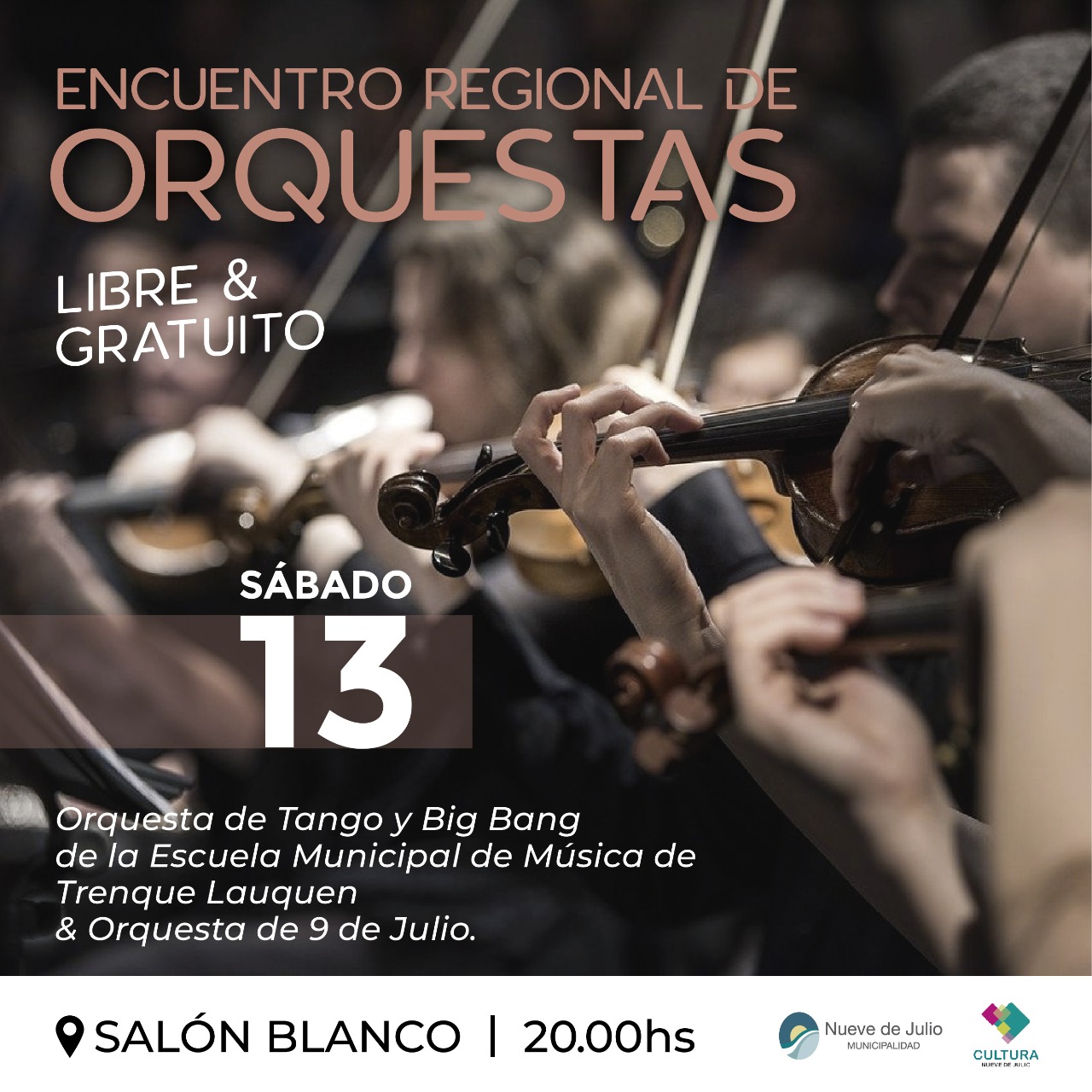 La Dirección de Cultura de la Municipalidad de Nueve de Julio se encuentra ultimando los detalles para la realización de un atractivo encuentro regional de orquestas, a realizarse el sábado 13 del corriente mes de agosto, en el Salón Blanco del Palacio Municipal, desde las 20,00 hs.