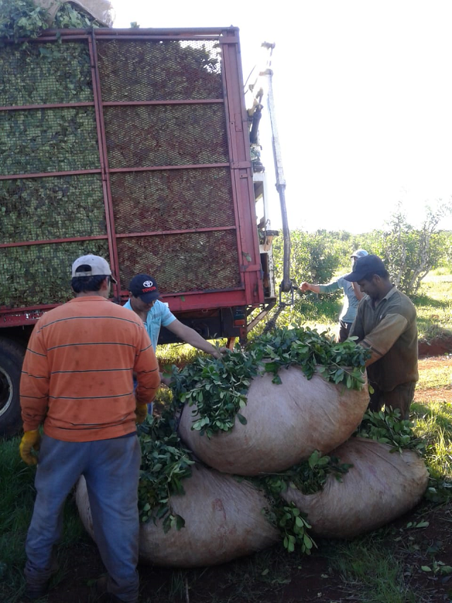 JQ: El trabajo es todo el año, cuidando, desmalezando, se hace el subsolado de la tierra que se realiza con una reja que rompe lo compacto del suelo para que entre la humedad, se abona, usamos herbicida para ir aplacando un poco la maleza, que en esta zona de Misiones es de varias clases y en gran cantidad. Te demanda una tarea de todo el año de seguimiento y control. Ahora estamos haciendo un corte, le decimos corte a la cosecha que está dividida en dos cortes. Los trabajadores rurales, los tareferos como comúnmente los llamamos acá, están haciendo ese trabajo que es a mano y se van cargado los camiones.