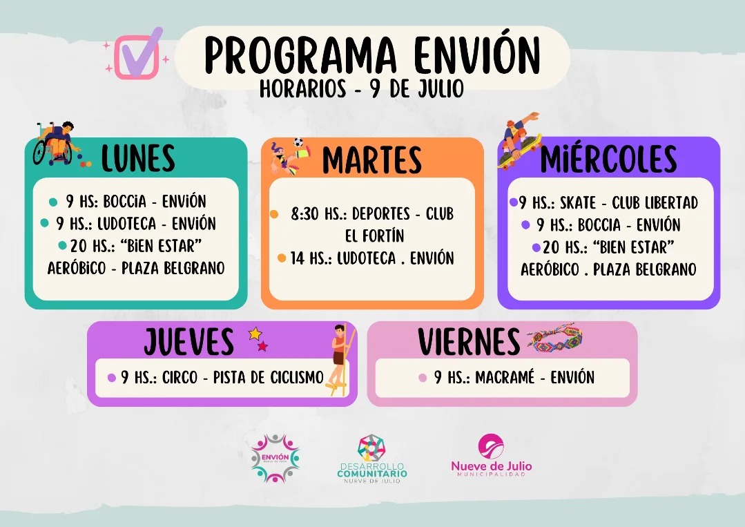 La Municipalidad de Nueve de Julio, bajo la coordinación de la Secretaría de Desarrollo Comunitario, anuncia la actualización de la agenda y horarios del Programa Envión para el ciclo 2026. Esta política pública, orientada a jóvenes de entre 12 y 21 años que residen en el distrito, busca brindar un acompañamiento integral a través de espacios gratuitos de inclusión, reflexión e intercambio.