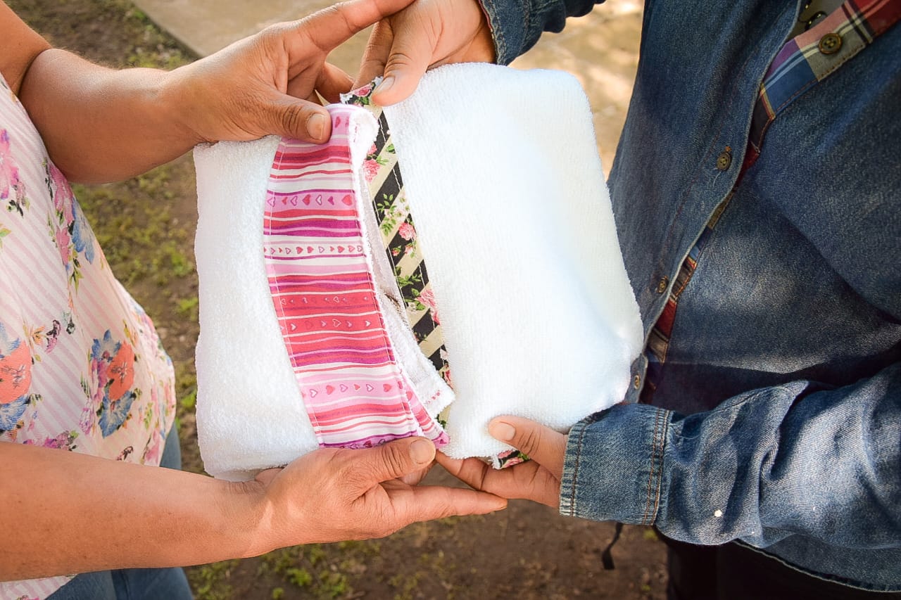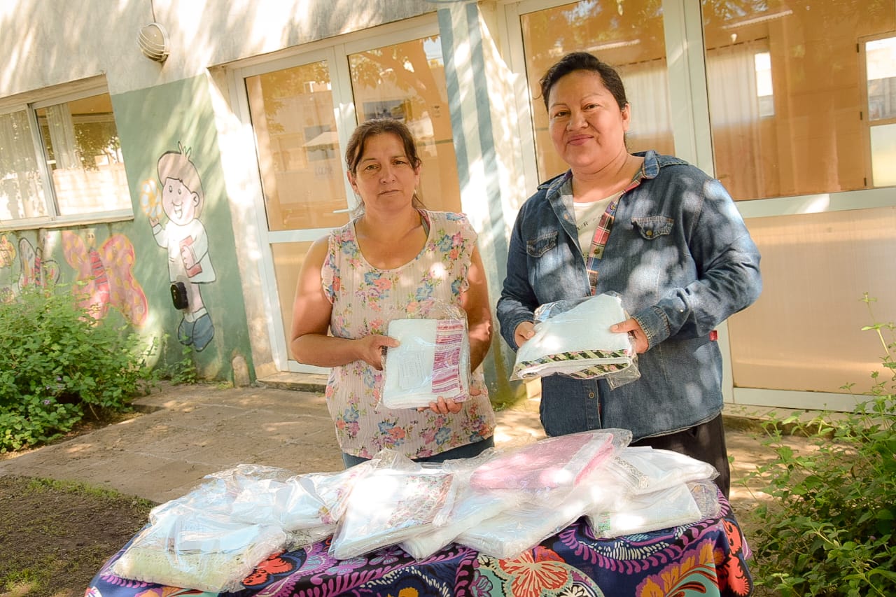En el mismo participan mujeres del barrio realizando una tarea de confección y costura de toallas de mano, toallas para bebés y turbantes.