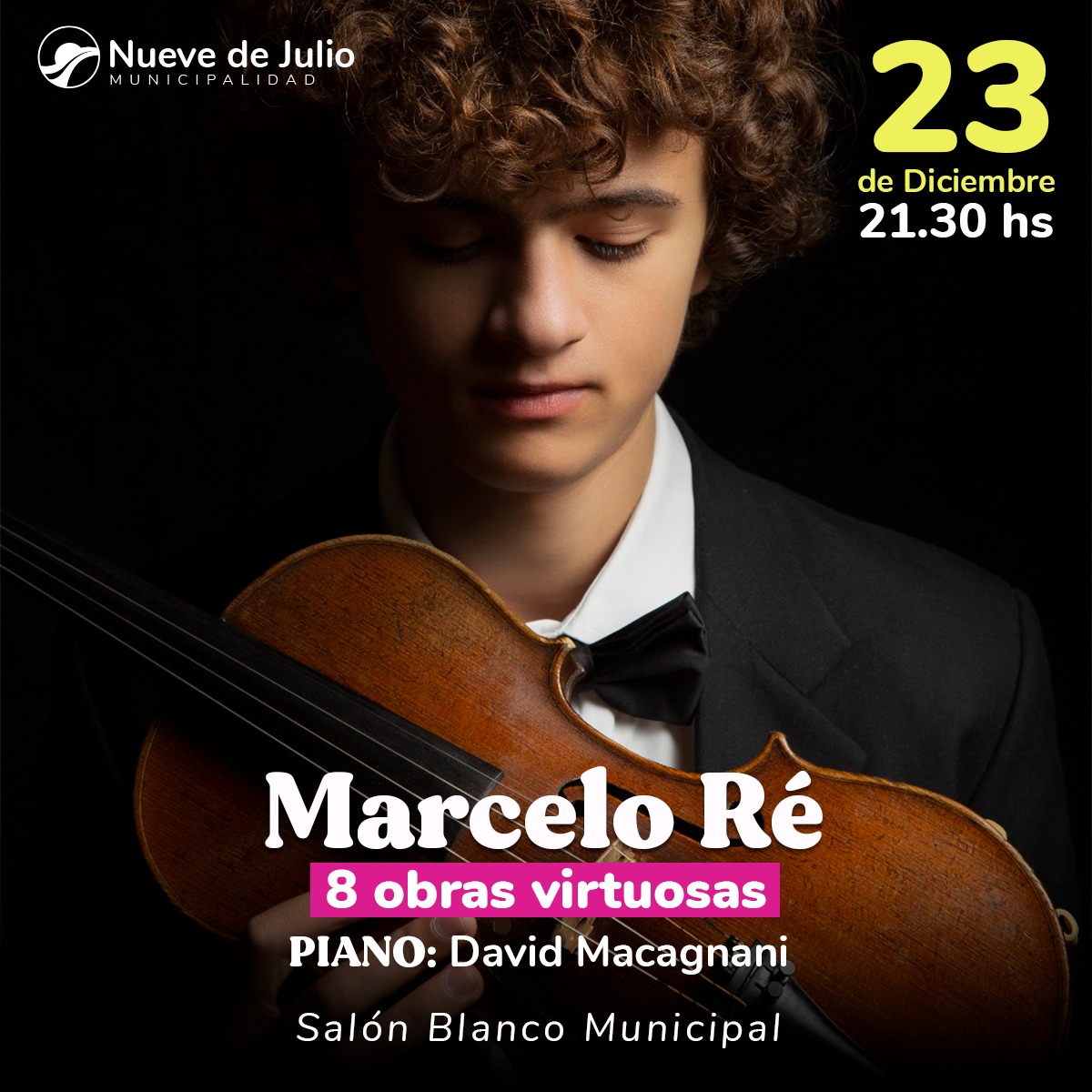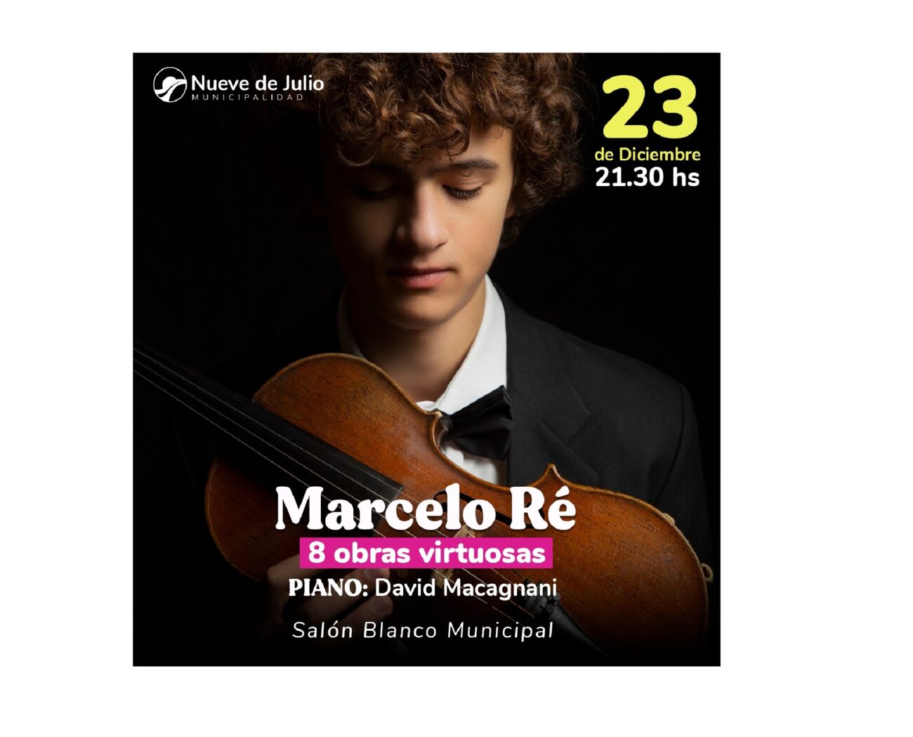 Mañana, sábado 23 de diciembre, a las 21,30 hs., en el Salón Blanco del Palacio Municipal, se presentará un gran espectáculo musical de excelente nivel, con la presentación del joven violinista de raíces nuevejulienses, Marcelo Ré; quien reside en España y ha recorrido los principales escenarios europeos; quien estará acompañado en la oportunidad por David Maccagnani en piano.