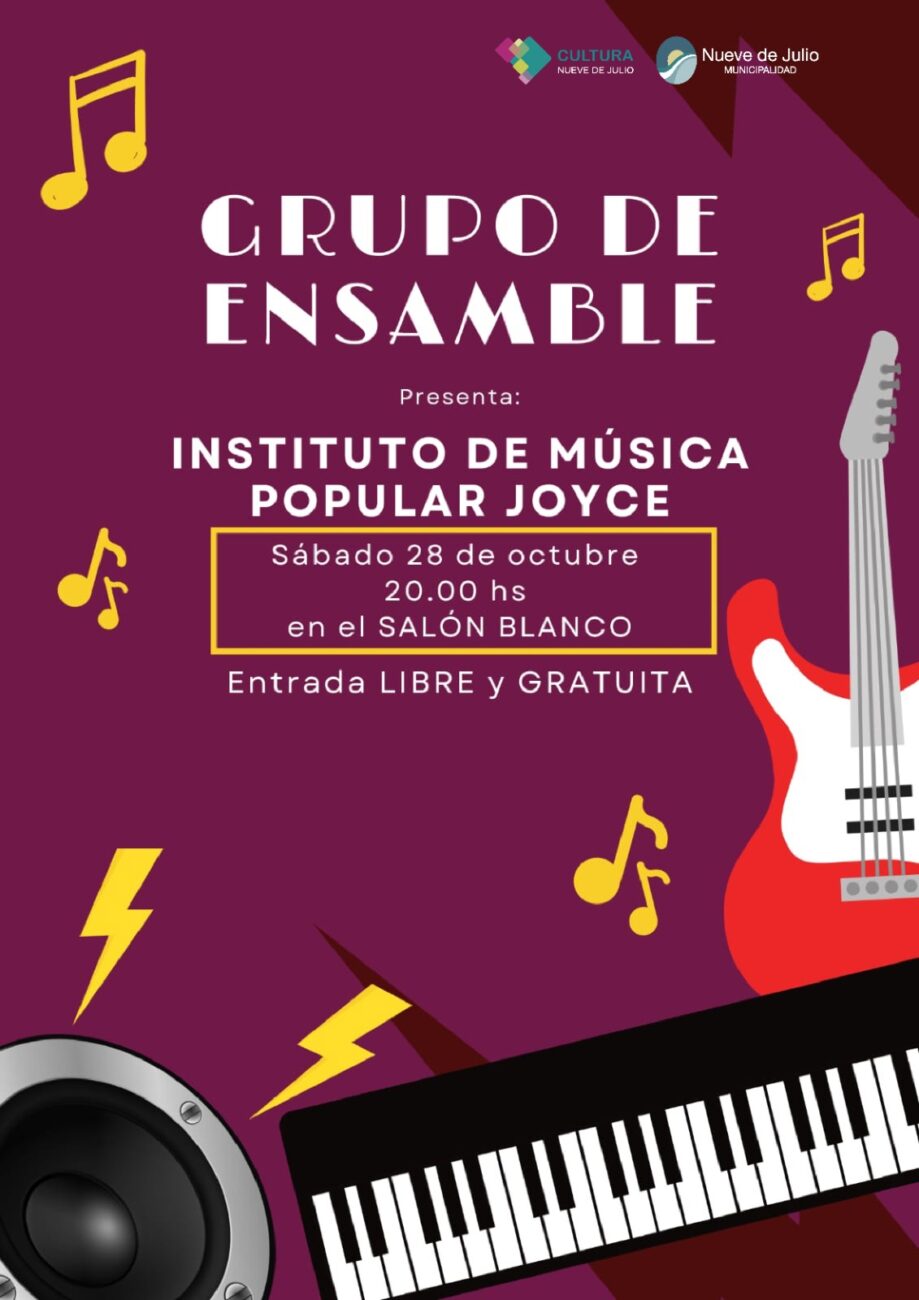 Con el auspicio de la dirección de Cultura de la Municipalidad de Nueve de Julio, mañana sábado 28 de octubre, en el Salón Blanco del Palacio Municipal, se presentará un atractivo espectáculo musical, a cargo del Instituto de Música Popular Joyce y su “Grupo de Ensamble”.