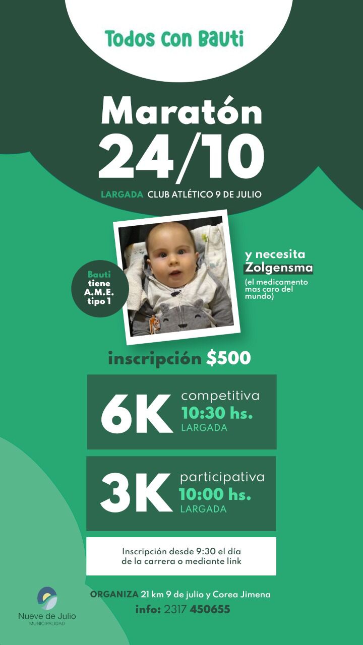 Este domingo 24, con largadas a las 10,00 y 10,30 hs., respectivamente, para las categorías recreativa (3 km) y competitiva (6km) en el Club Atlético 9 de Julio, se llevará adelante una prueba atlética destinada a recaudar fondos y colaborar con la campaña “Todos con Bauti”.