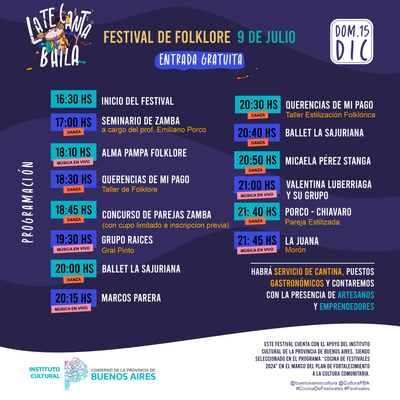 Contará con una grilla que contempla artistas musicales, ballets de danza folklórica, clases intensivas y concurso de zamba. Además habrá servicio de cantina completo, con la presencia de artesanos y emprendedores durante toda la jornada.