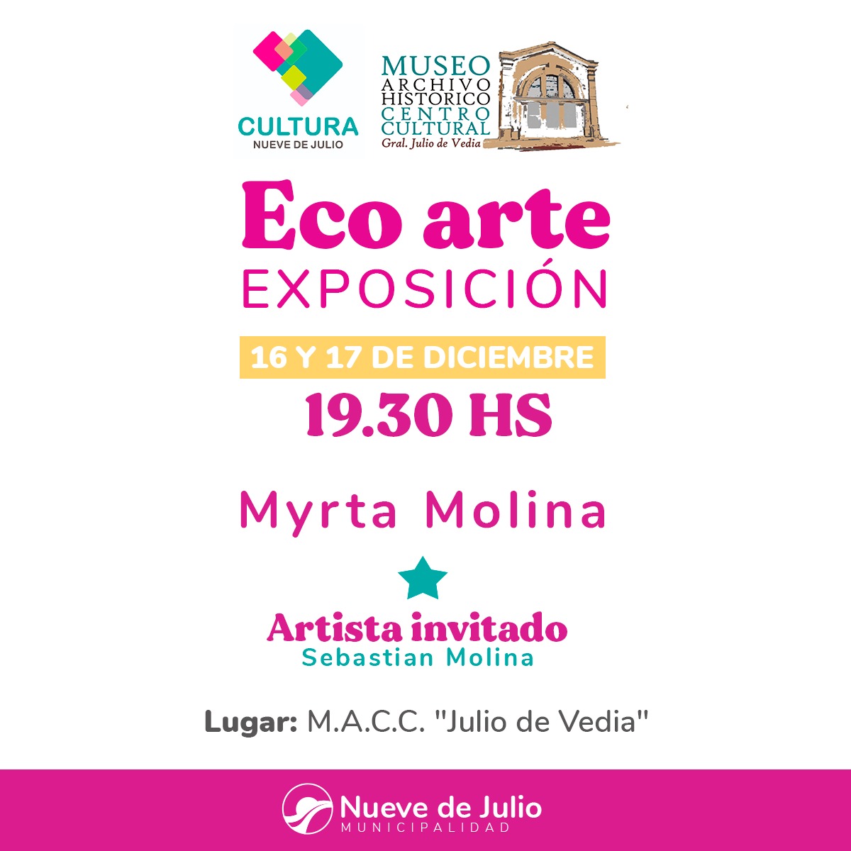 Este sábado y domingo, en la sede del Museo, Archivo Histórico y Centro Cultural “Julio de Vedia”, se realizará la exposición “Eco Arte”, a cargo de la Prof. Myrta Molina y Sebastián Molina, como artista invitado.