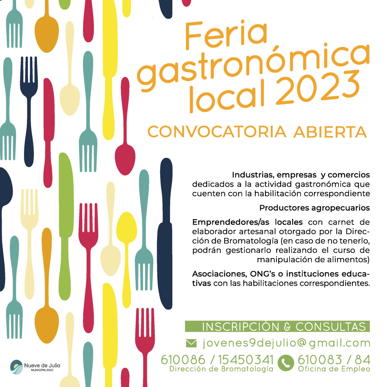 La Municipalidad de Nueve de Julio convoca a industrias, empresas  y comercios dedicados a la actividad gastronómica que cuenten con la habilitación correspondiente, productores agropecuarios, emprendedores locales con carnet de elaborador artesanal otorgado por la Dirección de Bromatología (en caso de no tenerlo, podrán gestionarlo realizando el curso de manipulación de alimentos), asociaciones, ONG’s o instituciones educativas con las habilitaciones correspondientes;  para la organización de la Feria Gastronómica Local 2023.