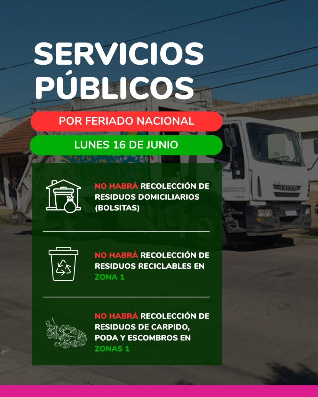 La Municipalidad de Nueve de Julio informa que hoy lunes feriado no habrá recolección de residuos domiciliarios en ninguna zona de la ciudad. Tampoco se recolectarán carpido, escombros ni poda en Zona 1, al igual que residuos reciclables en el mismo sector.