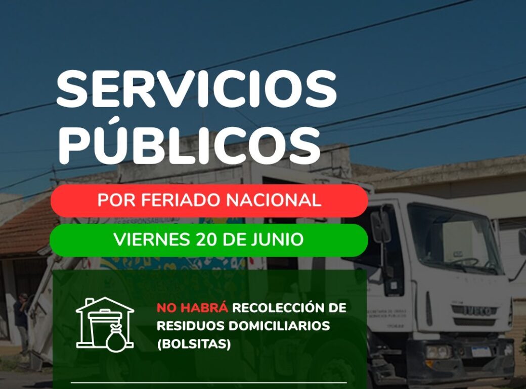 La Municipalidad de Nueve de Julio informó que el viernes 20 de Junio, feriado nacional, no habrá recolección de residuos domiciliarios (bolsitas) en toda la ciudad. Tampoco se recolectarán productos de carpidos, escombros y poda en Zona 5 ni residuos reciclables en el mismo sector.