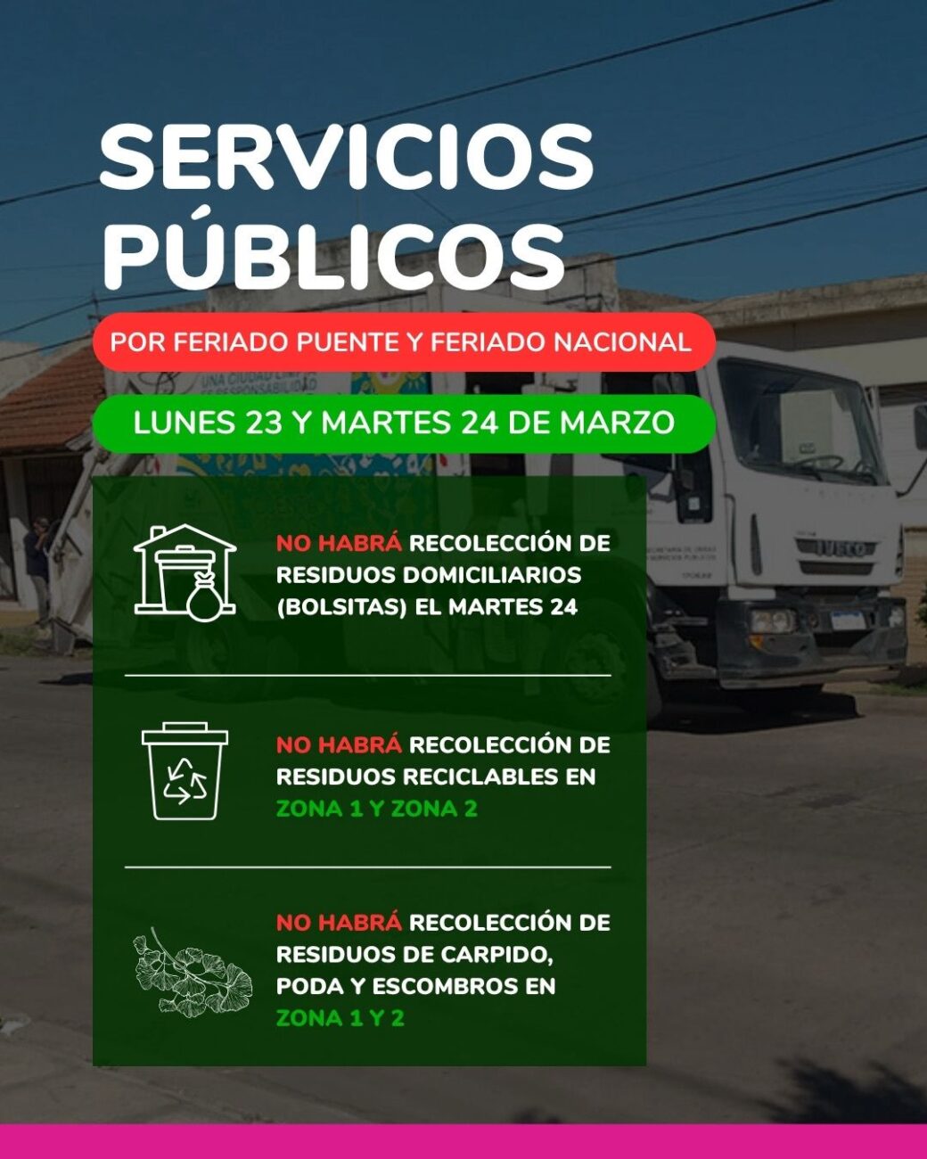 La Municipalidad de Nueve de Julio anunció que el servicio de recolección de residuos domiciliarios operará de manera habitual durante el lunes, aunque se suspenderá totalmente el martes 24. En lo que respecta a las tareas de carpido y la recolección de materiales reciclables en las zonas 1 y 2, las autoridades informaron que no habrá actividad en ninguno de los dos días.