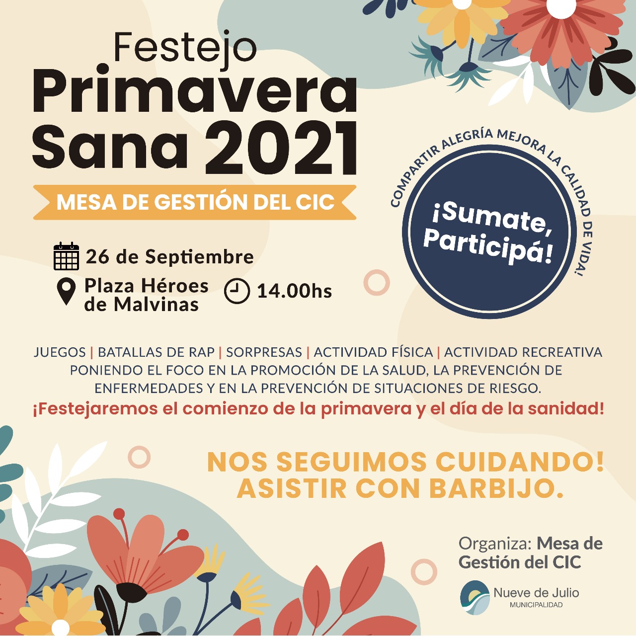 Con la organización de la Mesa de Gestión del Centro Integrador Comunitario (CIC), y el apoyo de la Municipalidad de Nueve de Julio, este domingo 26 de septiembre, desde las 14 hs., se desarrollará en la Plaza Héroes de Malvinas un gran encuentro de Festejo de la Primavera Sana 2021, celebrando el comienzo de la primavera y el día de la sanidad.