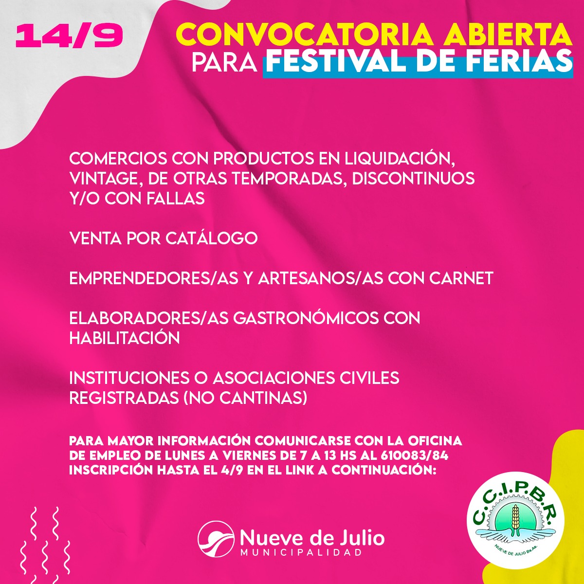 La Municipalidad de Nueve de Julio, a través de la Oficina de Empleo, y de manera conjunta con la Cámara de Comercio e Industria de nuestra ciudad, abre la convocatoria para el “Festival de Compras”, a realizarse el día sábado 14 de septiembre; y que comprenderá a comercios con productos en liquidación, vintage, de otras temporadas, discontinuos y/o con fallas; vecinos que realicen venta por catálogo; emprendedores y artesanos con carnet; elaboradores gastronómicos con habilitación e instituciones civiles registradas (no cantinas).