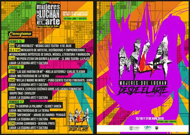 Los días 15, 16 y 17 de noviembre, tendrá lugar en nuestra ciudad el Primer Festival de Teatro itinerante de mujeres y disidencias “Mujeres que luchan desde el arte”: con un cronograma que incluye siete obras de teatro de toda la provincia, una obra estreno del grupo local Medias Cucú, un mercado de emprendedoras y artistas y un montón de intervenciones artísticas de música, literatura, danza y artes plásticas.