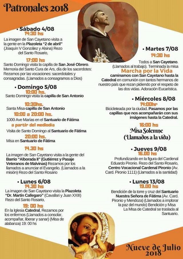 Las celebraciones principales serán el martes 7 en San Cayetano con una misa y a posterior Marcha por la Vida. Mientras que el miércoles 8 de agosto se realizará una bicicletada que concluirá en Catedral con una Misa Solemne presidida por Monseñor Ariel Torrado Mosconi.