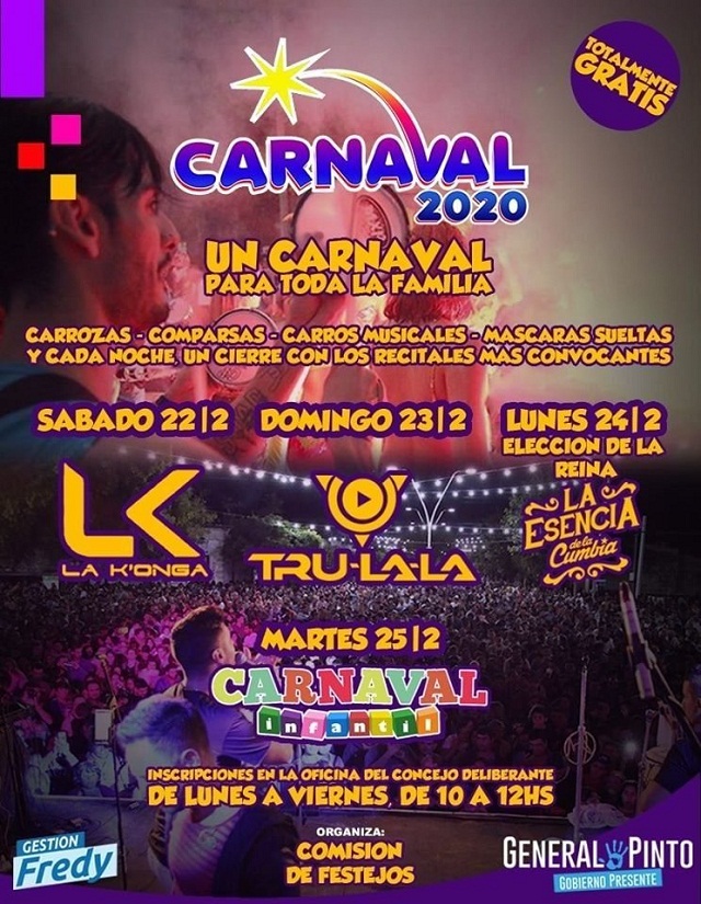 Mientras que los días sábado 22, domingo 23, lunes 24 y el martes 25 de febrero General Pinto se suma a los festejos por carnaval. Desde la comisión organizadora confirmaron las bandas que cerrarán las tres noches centrales: La Konga, Tru La La y La Esencia de la Cumbia .