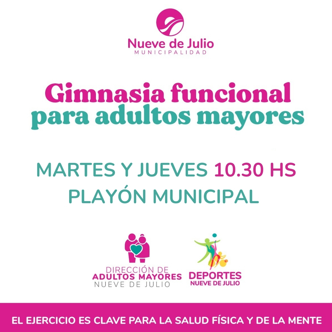 La Municipalidad de Nueve de Julio, a través de las direcciones de Adultos Mayores y Deportes, invita a los vecinos a sumarse a la actividad de gimnasia funcional para adultos mayores, actividad que se viene desarrollando desde hace dos años en el Playón Municipal, todos los martes y jueves, desde las 10,30 hs.