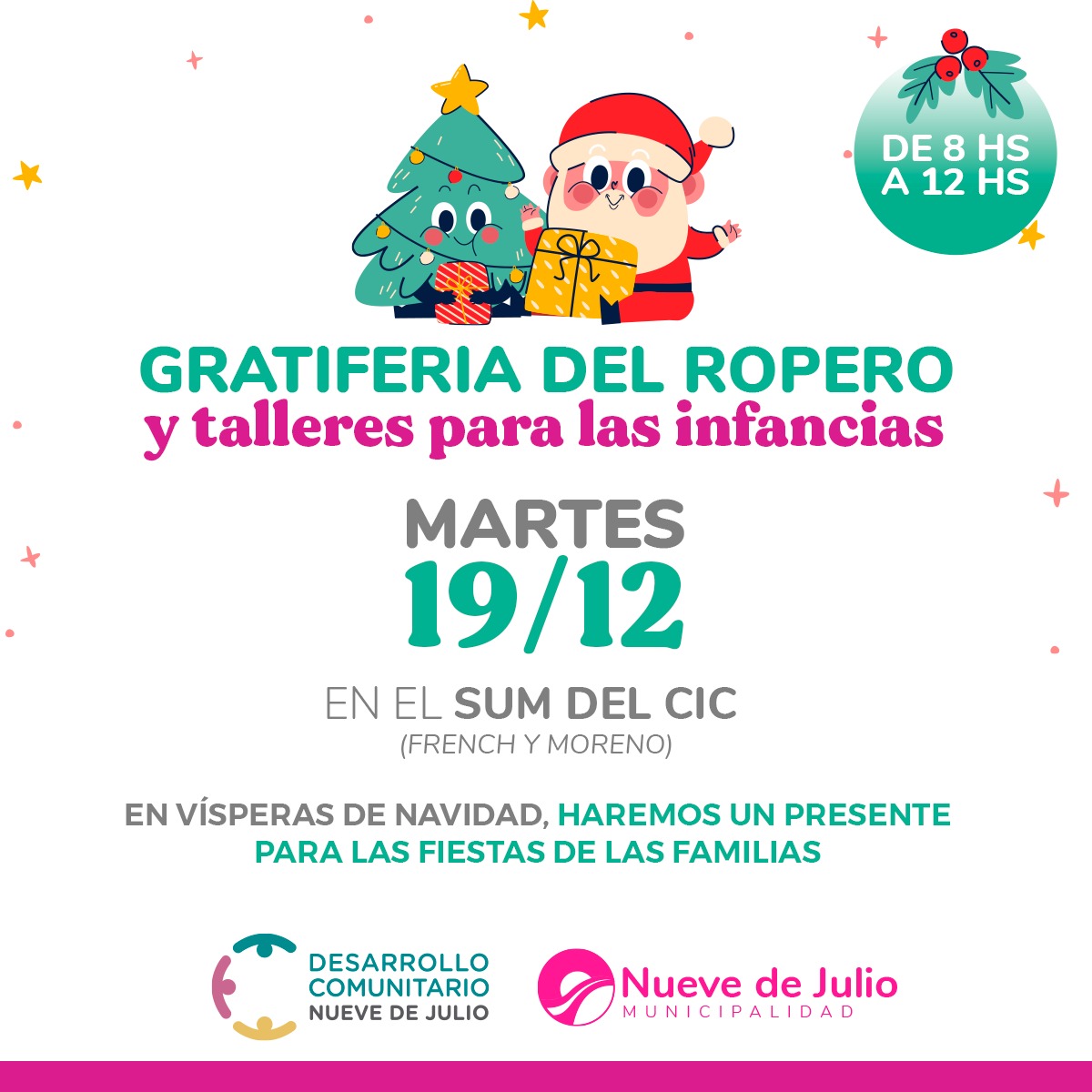 Este martes, de 8 a 12 hs., la secretaría de Desarrollo Comunitario de la Municipalidad de Nueve de Julio convoca a las familias e infancias en el SUM del Centro Integrador Comunitario (CIC), dónde se llevará a cabo la gratiferia con ropa y algunos regalitos para estas fiestas.