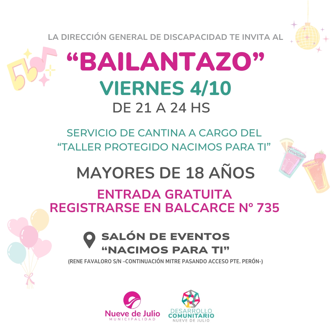 La dirección de Discapacidad de la Municipalidad de Nueve de Julio se encuentra organizando un gran “Bailantazo” para mayores de 18 años, a realizarse el viernes 4 de octubre, de 21 a 24 hs., en el salón de eventos de la Asociación de Ayuda al Discapacitado “Nacimos Para Ti”, con completo servicio de cantina a cargo del Taller Protegido de esta entidad.