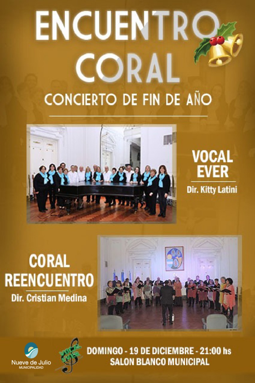 Con el auspicio de la Dirección de Cultura de la Municipalidad de Nueve de Julio, se habrá de desarrollar, el próximo domingo 19 de diciembre, desde las 21 hs., y en el Salón Blanco Municipal, un gran encuentro coral de fin de año.
