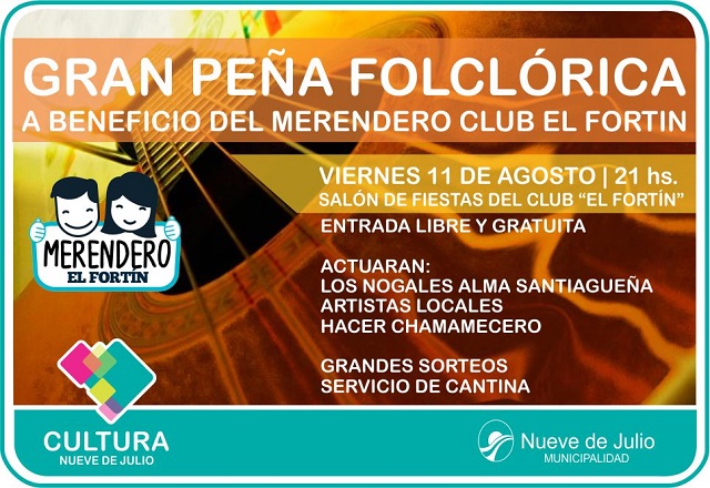 En la noche de hoy, viernes 11, desde las 21 hs., en el salón de fiestas del Club El Fortín, y con entrada libre y gratuita, se desarrollará una gran peña folklórica a beneficio del merendero de la institución.