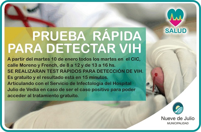 b4b06138-19ae-4bc1-9ebf-01dfe3acb9adEl centro de testeo rápido de HIV funcionará en el Centro Integrador Comunitario (CIC) ubicado en  calles French y Moreno de Ciudad Nueva, los días martes, de 8 a 14 hs., siendo sus responsables profesionales debidamente capacitados para practicar este procedimiento. Tras una entrevista previa se realizará el análisis –de carácter gratuito y anónimo- y posteriormente se informará el resultado; que en caso de ser positivo, junto al Servicio de Infectología del Hospital, se efectuará un seguimiento y acompañamiento del paciente.