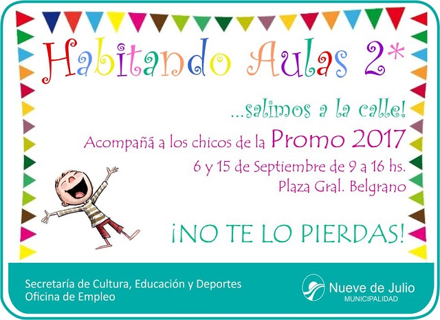 La Secretaria de Cultura, Educación y Deportes y la Oficina de Empleo de la Municipalidad de Nueve de Julio, llevará adelante desde hoy el segundo “Habitando Aulas” del presente calendario, que en esta oportunidad “sale a la calle” con el fin de llevar esta interesante propuesta a más jóvenes de la ciudad.