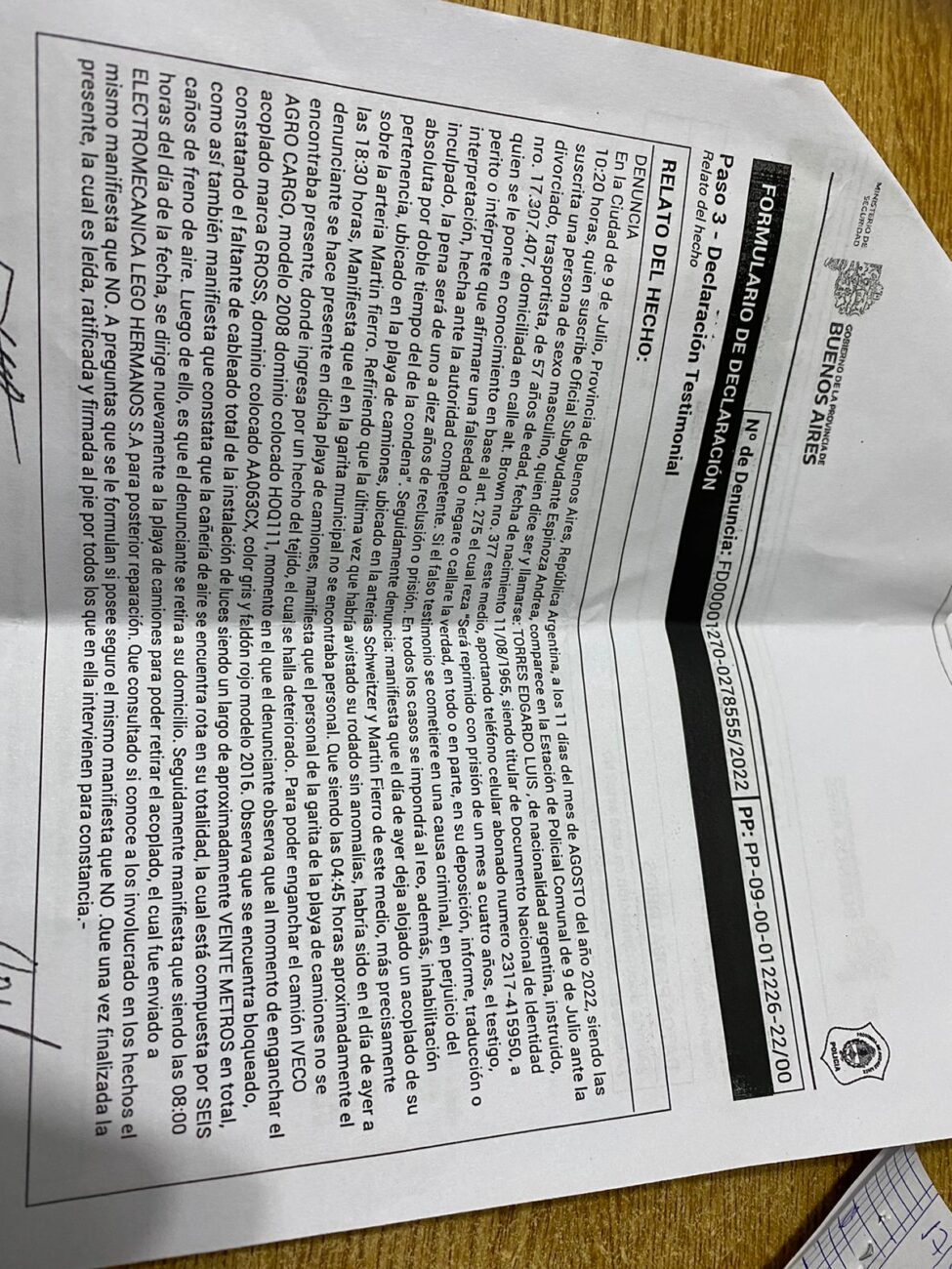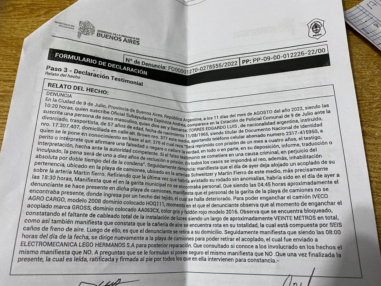 Además el día 11 de agosto un transportista el Sr. Gerardo Torres que deja habitualmente su camión en la playa de camiones, se encontró con que le habían sustraído todos los cables de las luces del acoplado (aproximadamente 20 metros) y tenía rupturas en las cañerías de los frenos a aire del mismo. Asimismo tomamos conocimiento que no es el único damnificado, otro transportista también le sustrajeron los cables, rompieron las ópticas y trataron de llevar la batería, en ambos casos se realizaron las denuncias correspondientes. Recordamos que hace unos meses desde el mismo lugar robaron dos ruedas a otro transportista.