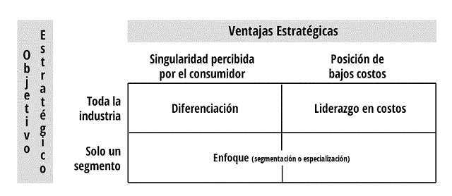 La estrategia de enfoque consiste en concentrarse en un segmento específico del mercado; es decir, concentrar los esfuerzos en producir o vender productos que satisfagan las necesidades o preferencias de un determinado grupo de consumidores dentro del mercado total que existe para los productos; siendo ellos productos al precio unitario más bajo disponible ó productos considerados únicos en el mercado.