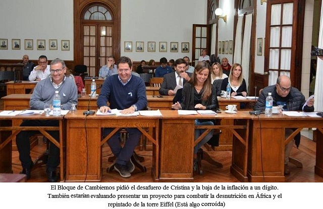 Para finalizar esta columna cultural, queremos informar que nuestro periodista apostado en el Honorable Concejo Delirante, aseguró que el bloque de Cambiemos pidió el desafuero de Cristina a través de un proyecto de comunicación. Nuestro avezado reportero, experto en disparates y plazos fijos, también pudo averiguar que en el entorno del bloque tienen ideado varios proyectos que saldrían a la luz antes de fin de año. A saber: Proyecto para declarar el fin de la hambruna en África, proyecto de resolución para declarar que la inflación sea de un dígito, proyecto de apoyo al repintado de la torre Eiffel (ya que se encuentra corroída y el gobierno francés no actúa), proyecto de resolución para que Maduro, presidente de Venezuela, renuncie a su mandato, proyecto de declaración para que la Antártida ponga freno al derretimiento gradual (los concejales consideran que es injusto que desaparezcan los glaciares).