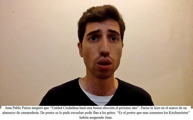 Por otra parte, desde unidad Ciudadana, Juan Pablo Parise aseguró que “Ya tenemos la juventud, tenemos las ganas y tenemos capacidad, solo nos faltan un par de bolsos para afrontar los gastos de campaña” aseguró Parise mientras terminaba de almorzar y se pedía un postre a los gritos. “¡Quiero flan!” sería el pedido de Parise quien aseguró también que “Todes tenemos el derecho de comer flan, nosotres y los niñes… todes nosotres…” finalizó JP (Juan Pablo) utilizando el famoso lenguaje inclusivo. También Parise se refirió a los cuadernos de la corrupción asegurando que “todo está armado para realizar una persecución política” finalizaba el joven Kirchnerista mientras pedía otra ronda de flan para los presentes.