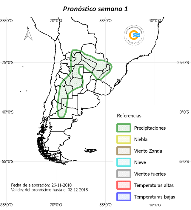 PRECIPITACIONES: entre los días martes 27 y domingo 02 se esperan lluvias y tormentas sobre: el este de Mendoza, La Pampa, San Luis, este de La Rioja, Córdoba, Santiago del Estero, Tucumán, centro y este de Salta, este de Jujuy, Chaco, Formosa, norte de Santa Fe, Corrientes y Misiones. Los valores de precipitación acumulada se estiman entre 30 y 100 mm en todo el período pudiendo ser superados de forma localizada. Cabe mencionar que los mayores valores se prevén para la región del noroeste argentino. Entre los días martes 27 y jueves 29, lluvias, chaparrones y ocasionales tormentas en el este de Neuquén, centro de Río Negro y este de Chubut con mejoramientos temporarios. Se esperan valores de precipitación entre 20 y 40 mm, pudiendo ser superados de forma puntual. También se esperan lluvias y ocasionales tormentas en el noreste de Santa Cruz el día miércoles 28. Los valores de precipitación no serán significativos. A partir del día viernes 30 y hasta el día sábado 01 inclusive se esperan lluvias y tormentas en Buenos Aires, Ciudad Autónoma de Buenos Aires, sur de Santa Fe y Entre Ríos. Los valores de precipitación acumulada no serán significativos.