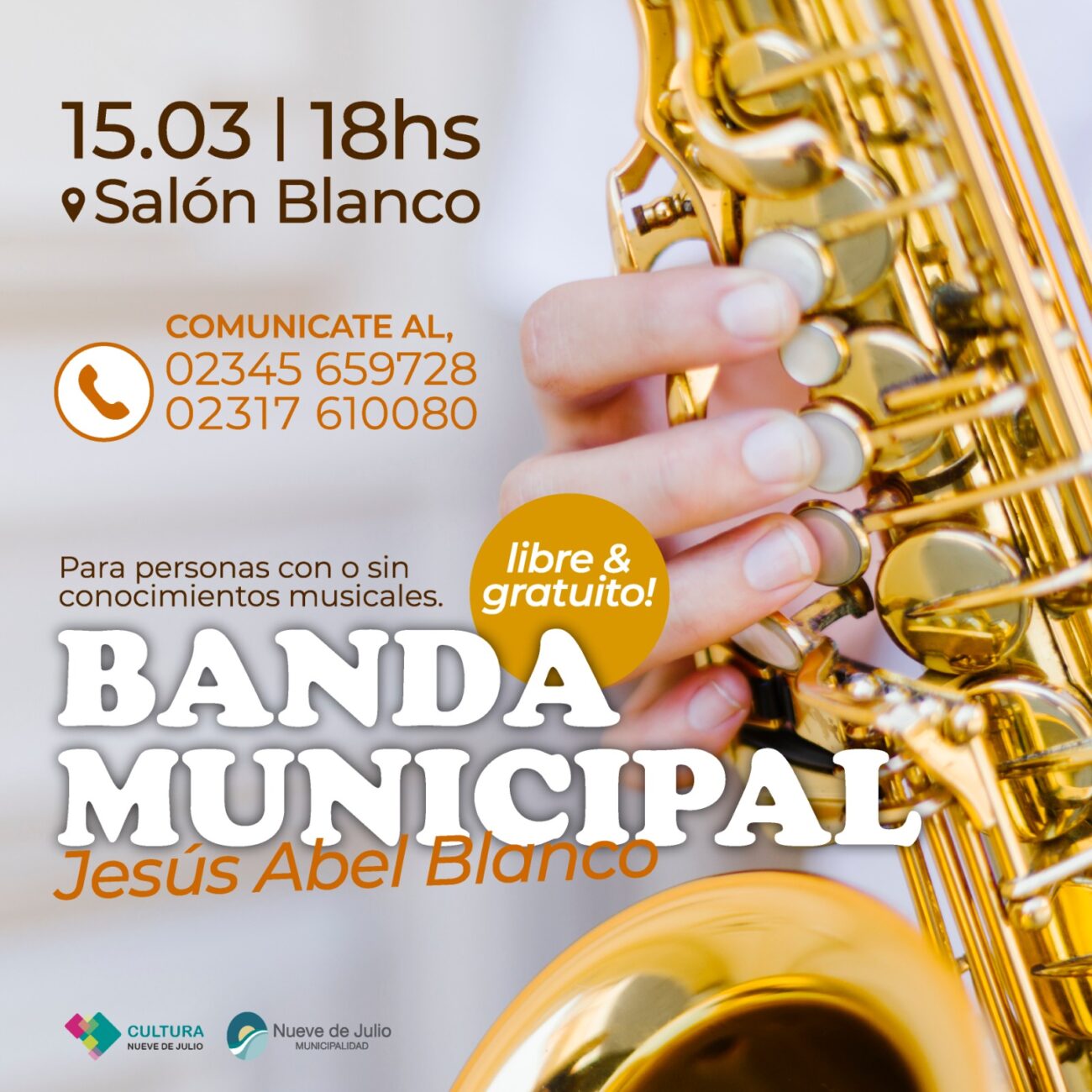 La Municipalidad de Nueve de Julio informa que se encuentra abierta la inscripción para sumarse a la Banda Municipal “Jesús Abel Blanco”, para personas con o sin conocimientos musicales, y en forma totalmente libre y gratuita.