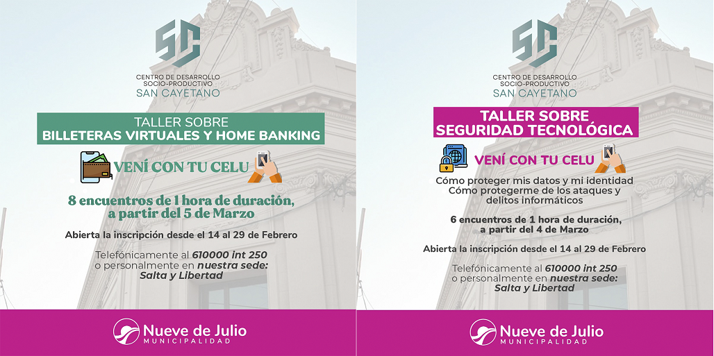 El Centro de Desarrollo Socio-Productivo “San Cayetano” abrió hoy, la inscripción para nuevos nuevos talleres sobre Seguridad Tecnológica, que se dictará desde el lunes 4 de marzo; y Billeteras Virtuales y Home Banking, que se dictará a partir del martes 5 de marzo.