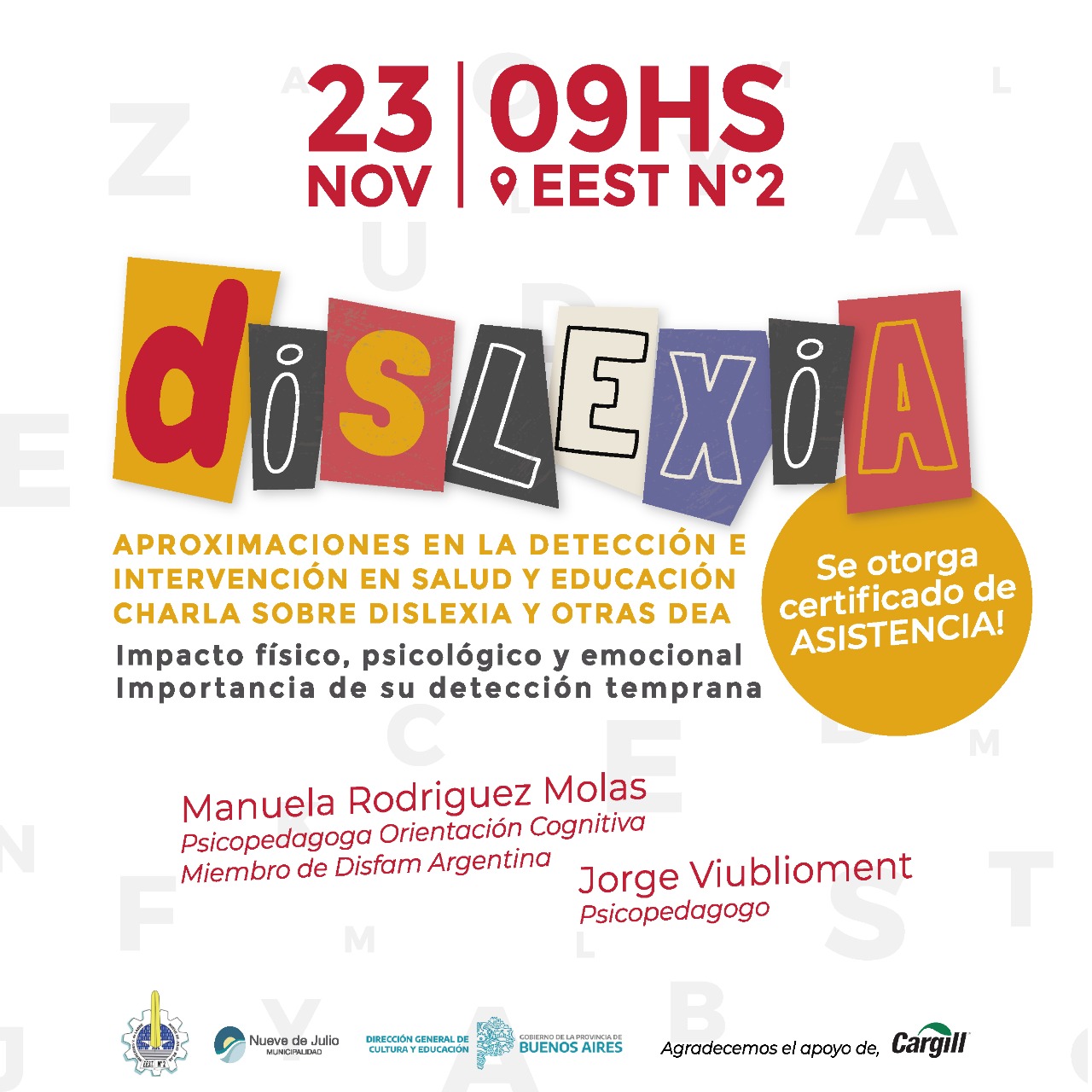 Con la organización de la ONG “Dislexia 9 de Julio” y el apoyo de la de la Municipalidad de Nueve de Julio, se desarrollará, el próximo miércoles 23 del corriente, desde las 09,00 hs. y en las instalaciones de la Escuela de Educación Secundaria Técnica Nº. 2, una interesante jornada sobre dislexia.