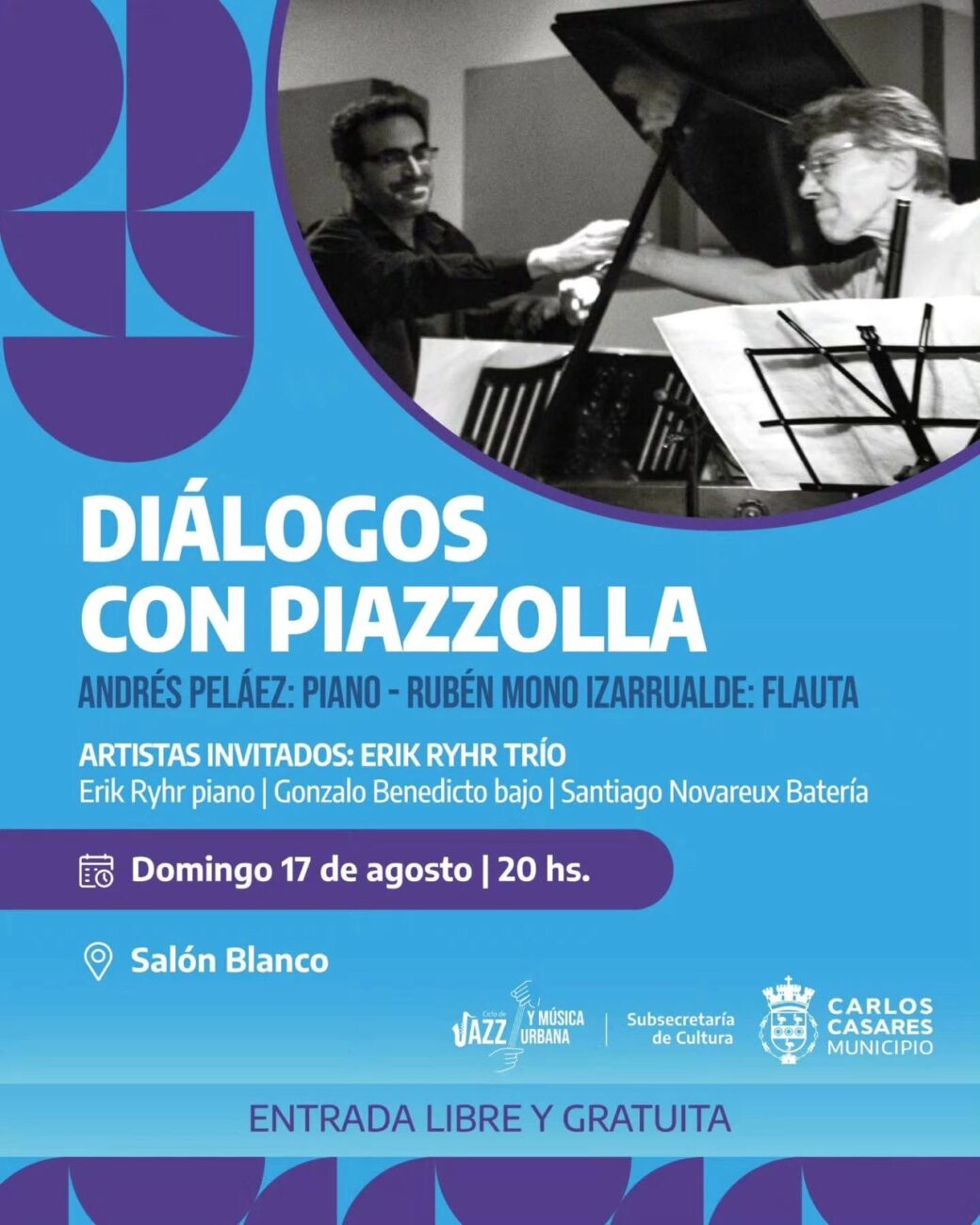 Este domingo culmina la tercera edición del Ciclo de Jazz y Música Urbana ideado por Fabio Molineti que es el Subdirector de Cultura de Carlos Casares. El cierre de la edición 2025 será con Andrés Peláez en piano y el “Mono” Insaurralde en flauta haciendo “Diálogos con Piazzola”.