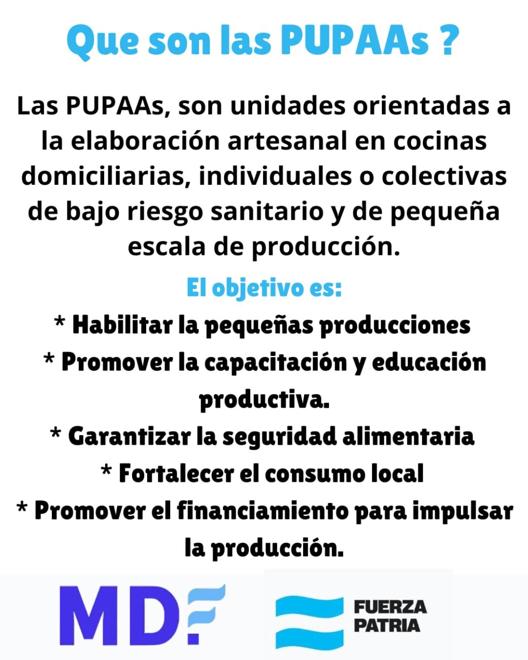 Las PUPAAs, son unidades orientadas a la elaboración artesanal en cocinas domiciliarias, individuales o colectivas de bajo riesgo sanitario y de pequeña escala de producción.