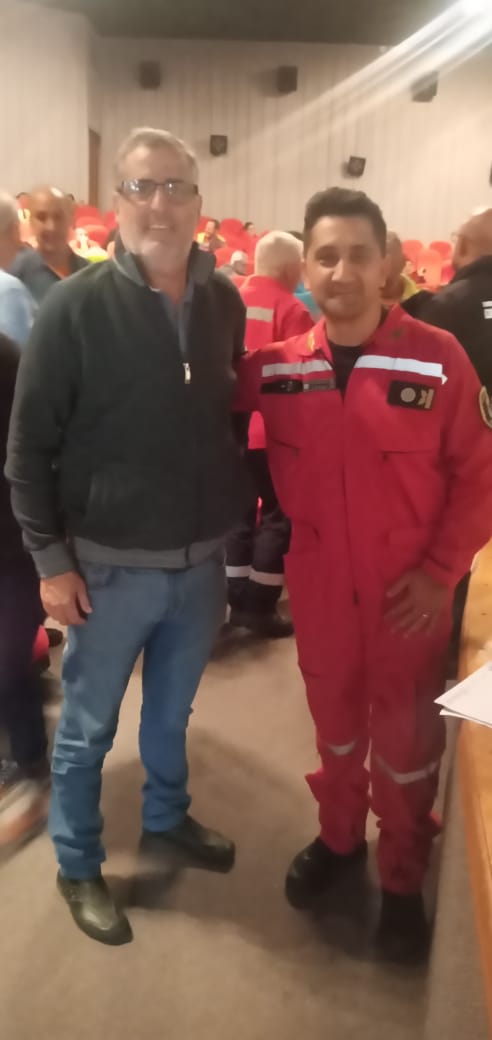 Epígrafe foto 2: Beltrán con el Comisario Inspector David Adrián Narváez, Jefe de la División Salvamento y Rescate de la Dirección de Riesgos Especiales dependiente de la Superintendencia de Seguridad Siniestral de Policía de la Provincia.
