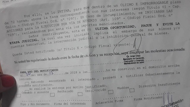 Desde el municipio han intimado a vecinos para que el pago de las tasas municipales adeudadas, más los intereses correspondientes a la mora en un plazo improrrogable de 72 horas.