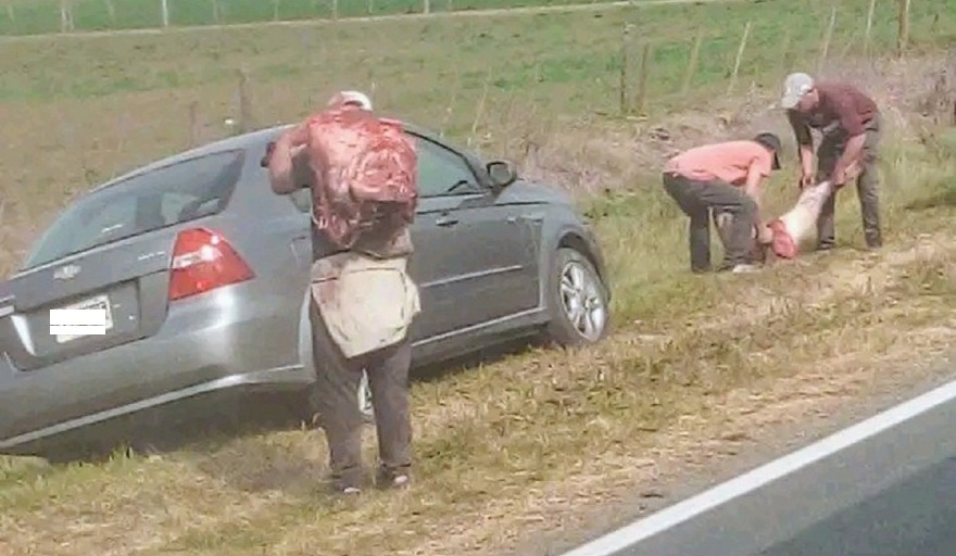Algunos vecinos y automovilistas vieron la oportunidad de aprovechar la situación y saquearon la carga del camión. Liberaron a las vacas atrapadas y, en medio del descontrol, comenzaron a faenarlas en la banquina para llevarse la carne.