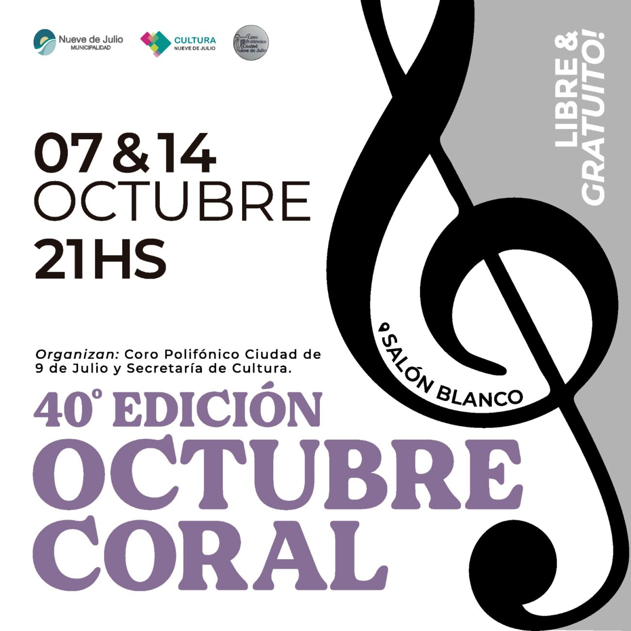 Con la organización del Coro Polifónico “Ciudad de 9 de Julio” y la dirección de Cultura municipal, se aceleran los preparativos para la 40ma. edición del tradicional encuentro anual de “Octubre Coral”, que se desarrollará los días sábado 7 y 14 del referido mes, desde las 21 hs., en el Salón blanco Municipal, y con agenda ya confirmada de presentaciones.